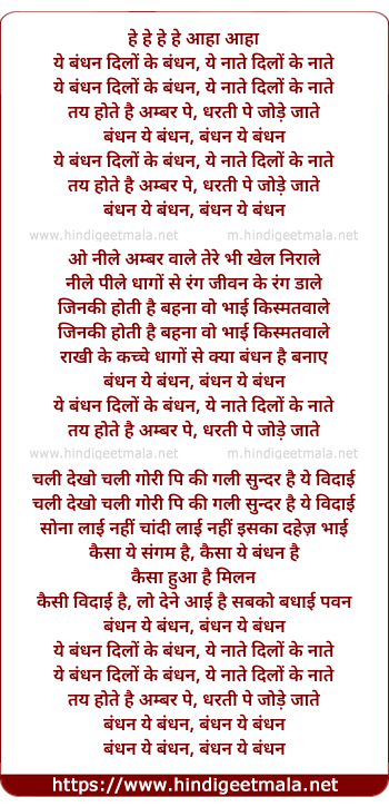 Lyrics of Yeh Bandhan Dilo Ke Bandhan - ये बंधन दिलों के बंधन