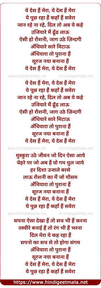 Lyrics of Ye Des Hai Mera - ये देश हैं मेरा