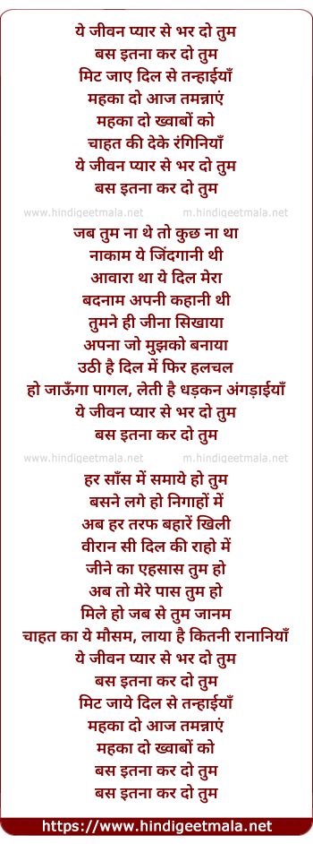Lyrics of Ye Jivan Pyar Se Bhar Do Tum - ये जीवन प्यार से भर दो तुम