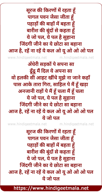 Lyrics of Yeh Jo Pal Yeh Pal Hai Suhaana - ये जो पल ये पल है सुहाना