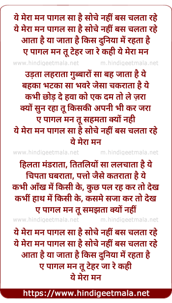 Lyrics of Yeh Mera Man - ये मेरा मन