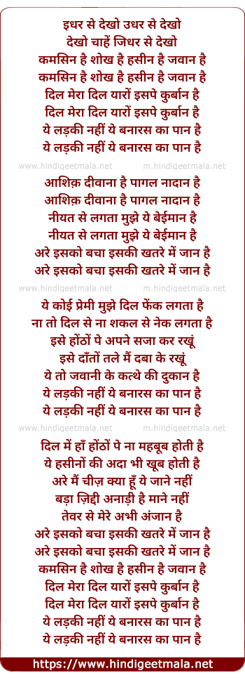 Lyrics of Yeh Ladakee Nahee Yeh Banaras Kaa Pan Hai - ये लड़की नहीं ये बनारस का पान है