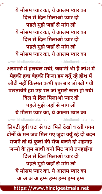 Lyrics of Ye Mausam Pyar Ka - ये मौसम प्यार का