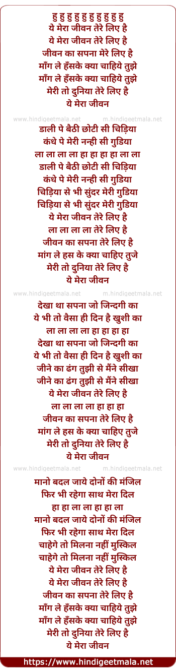 Lyrics of Yeh Mera Jivan Tere Liye Hai (Duet)