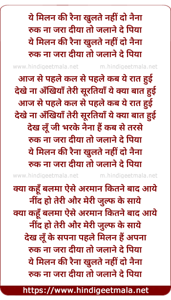 Yeh Milan Ki Raina Khulte Nahi Do Naina Ruka Ja Jara Diya Toh Jalene Do - ये मिलन की रैना खुलते नहीं दो नैना रुका ना जरा दीया तो जलाने दो