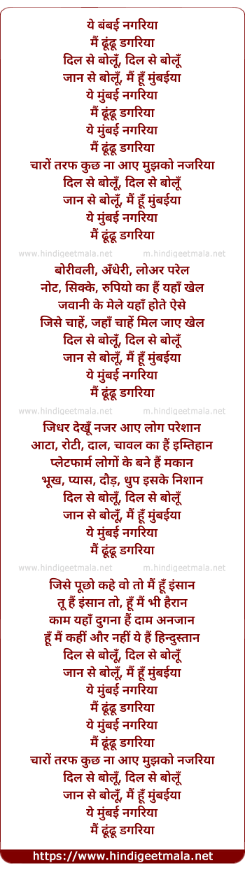 Lyrics of Yeh Mumbai Nagariya - ये बंबई नगरिया