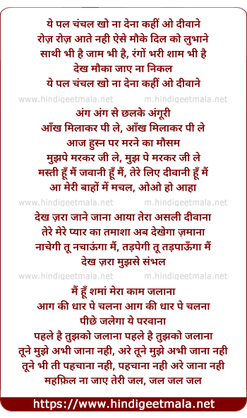 Lyrics of Yeh Pal Chanchal Kho Naa Dena Kahee O Diwane - ये पल चंचल खो ना देना कहीं ओ दीवाने