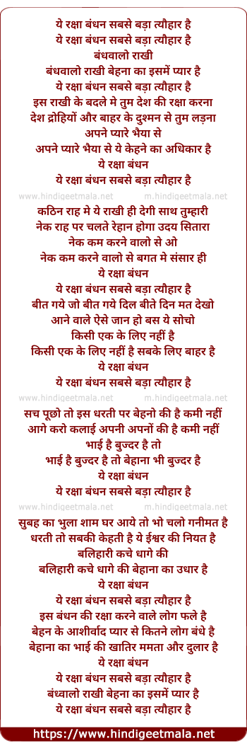 Lyrics of Ye Raksha Bandhan Sabse Bada Tayohaar Hai - ये रक्षा बंधन सबसे बड़ा त्यौहार है