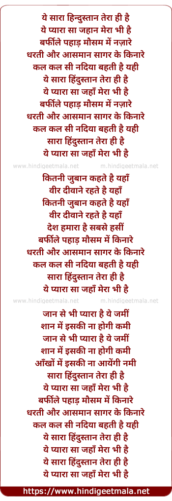 Lyrics of Yeh Saara Hindustaan Teraa Hee Hai - ये सारा हिन्दुस्तान तेरा ही है