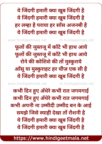 Lyrics of Ye Zindagi Hamari Kya Khub Jindagi Hai - ये जिंदगी हमारी क्या खूब जिंदगी है