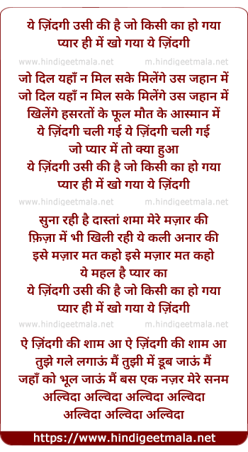 Lyrics of Yeh Zindagi Usi Ki Hai Jo Kisi Ka Ho Gaya - Sad Version - ये ज़िंदगी उसी की है जो किसी का हो गया
