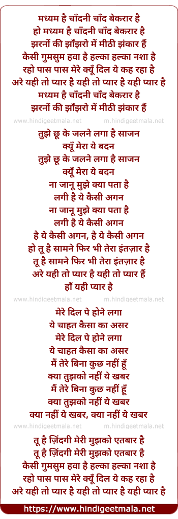 Lyrics of Madhyam Hai Chandni, Yehi To Pyar Hai - मध्यम है चाँदनी यही तो प्यार है