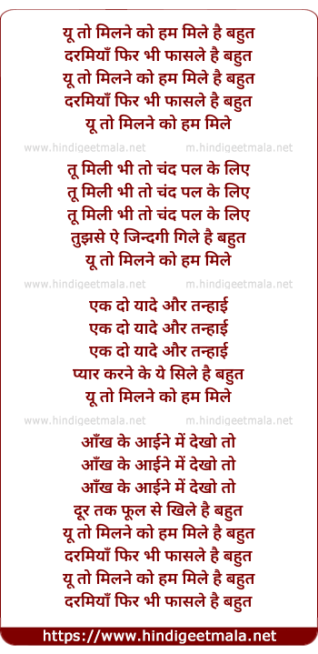 Lyrics of Yu Toh Milane Ko Ham Mile Hain Bahot - यू तो मिलने को हम मिले है बहुत