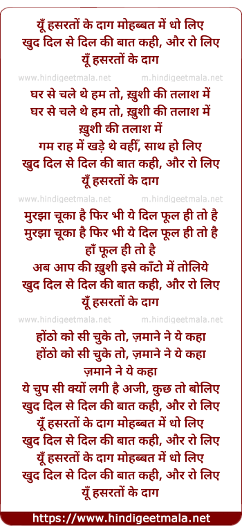 Lyrics of Yu Hasrato Ke Daag Mohabbat Me Dho Liye - यूँ हसरतों के दाग मोहब्बत में धो लिए