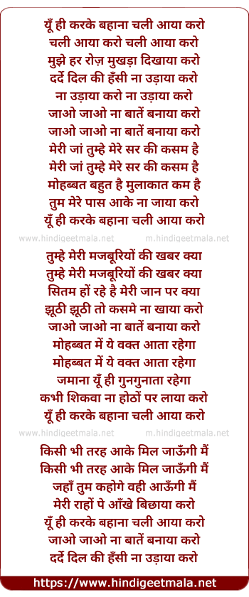 Lyrics of Yun Hi Kar Ke Bahana - यूँ ही करके बहाना