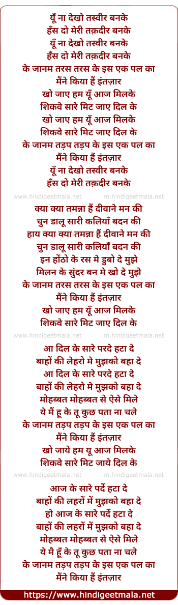 Lyrics of Yun Na Dekho Tasveer Banke - यूँ ना देखो तस्वीर बनके