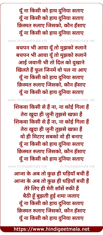 Lyrics of Yun Na Kisi Ko - यूँ ना किसी को हाय दुनिया सताए