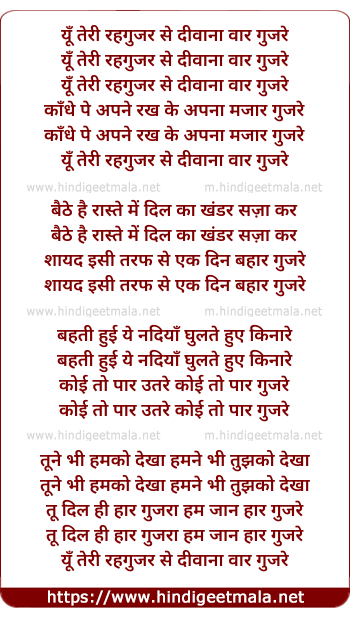 Lyrics of Yun Teri Raah - यूँ तेरी रहगुजर से दीवाना वार गुजरे