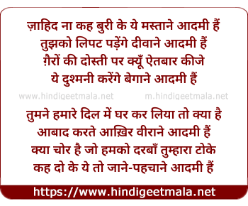 Lyrics of Zaahid Na Kah Buri Ke Ye Mastaane Aadami Hain - ज़ाहिद न कह बुरी के ये मस्ताने आदमी हैं