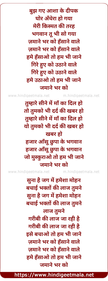 Lyrics of Zamane Bhar Ko Hasane Wale - ज़माने भर को हँसाने वाले