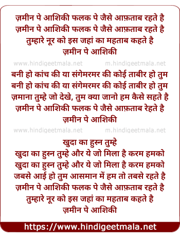 Lyrics of Zameen Pe Aashiqui - ज़मीन पे आशिकी फलक पे जैसे आफ़ताब रहते है