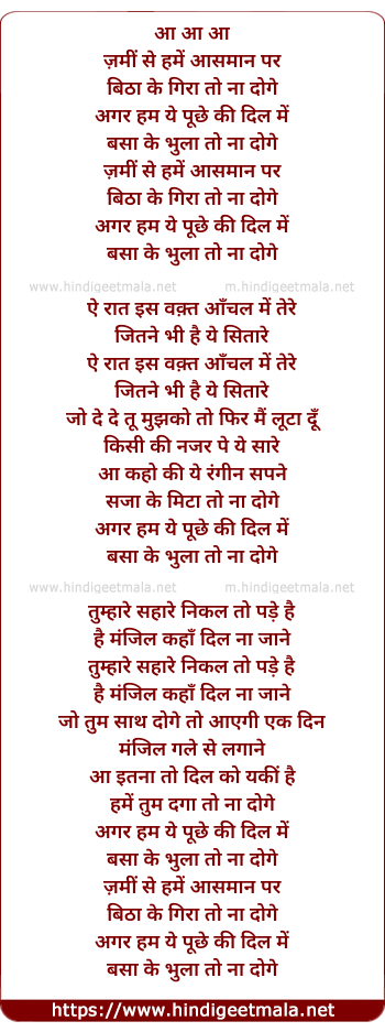 Lyrics of Zamin Se Hamen Aasamaan Par Bithaa Ke Giraa To Na Doge - ज़मीं से हमें आसमान पर बिठा के गिरा तो ना दोगे