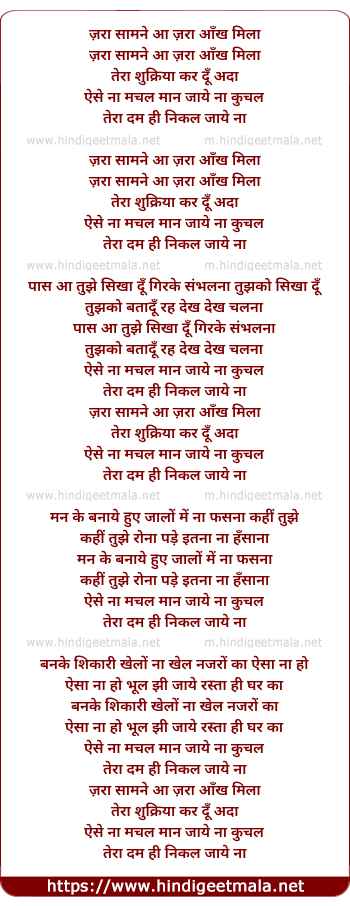 Lyrics of Zara Saamne Aa Zara Ankh Mila - ज़रा सामने आ ज़रा आँख मिला