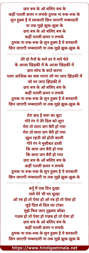 Lyrics of Zaraa Bach Ke O Balie Bach Ke - ज़रा बच के ओ बलिए बच के