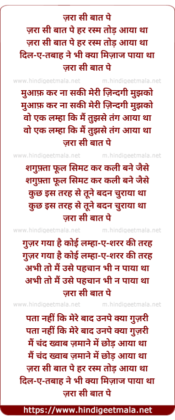 Lyrics of Zaraa Si Baat Pe Har Rasm Tod Aayaa Thaa - ज़रा सी बात पे हर रस्म तोड़ आया था
