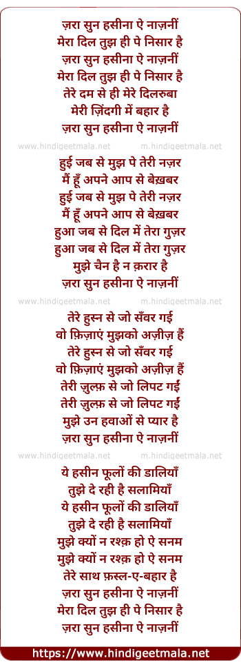 Lyrics of Zaraa Sun Hasinaa Ai Naazanin - ज़रा सुन हसीना ऐ नाज़नीं