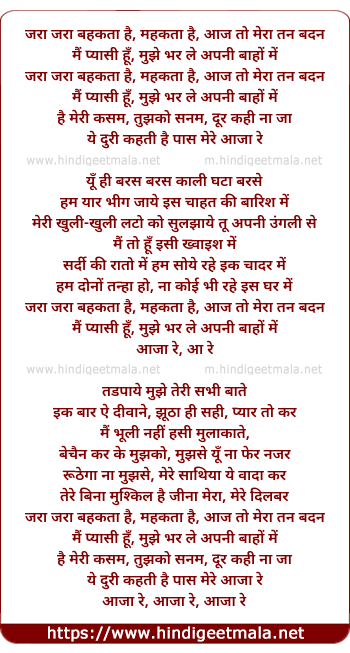 Lyrics of Zaraa Zaraa Bahakataa Hai, Mahakataa Hai, Aaj To Mera Tan Badan - जरा जरा बहकता है, महकता है, आज तो मेरा तन बदन
