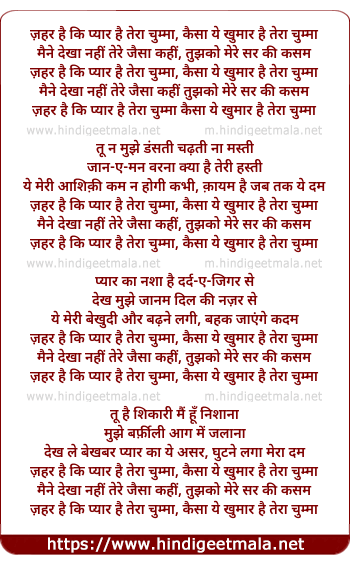 Lyrics of Zehar Hain Ke Pyar Hain Tera Chumma - ज़हर है की प्यार है तेरा चुम्मा