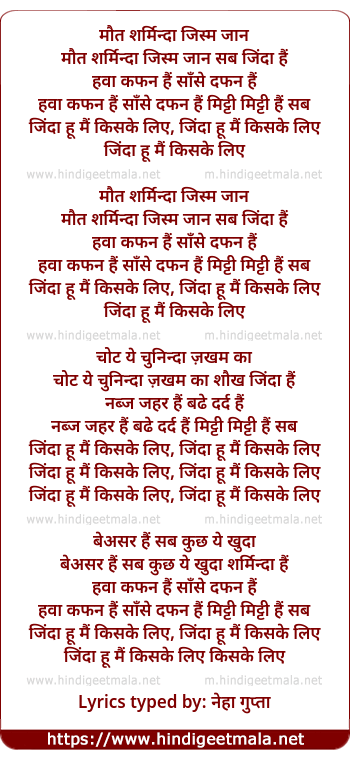 Lyrics of Zinda Hu Main Kiske Liye - जिंदा हूँ मैं किसके लिए