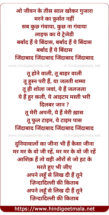 Lyrics of Zindabad - ओ जीवन के तीस साल खोकर गुजारा