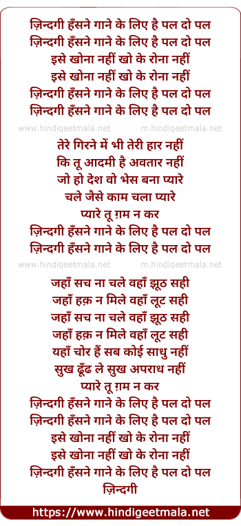 Lyrics of Zindagi Hansne Gaane Ke Liye Hai Pal Do Pal - ज़िन्दगी हँसने गाने के लिए है पल दो पल