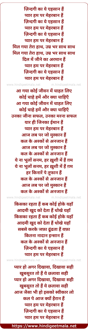 Lyrics of Zindagi Ka Yeh Ehsaan Hai - ज़िन्दगी का ये एहसान हैं