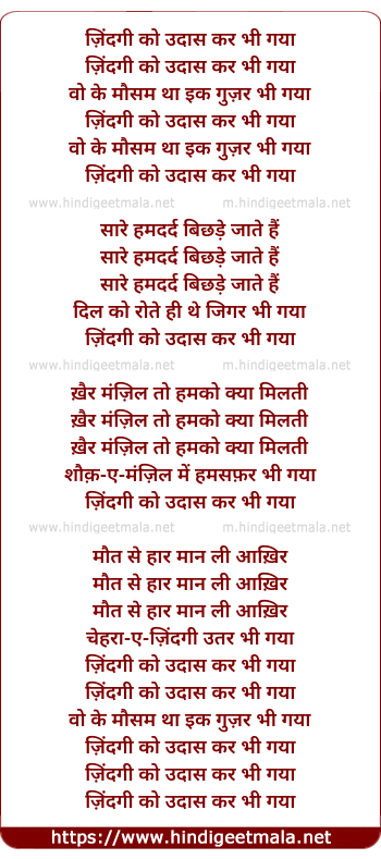 Lyrics of Zindagi Ko Udaas Kar Bhi Gayaa - ज़िंदगी को उदास कर भी गया