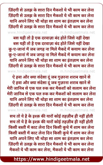 Lyrics of Zindagi Se Ulajh Ke Saaraa Din - ज़िंदगी से उलझ के सारा दिन मैकशो ये भी काम कर लेना