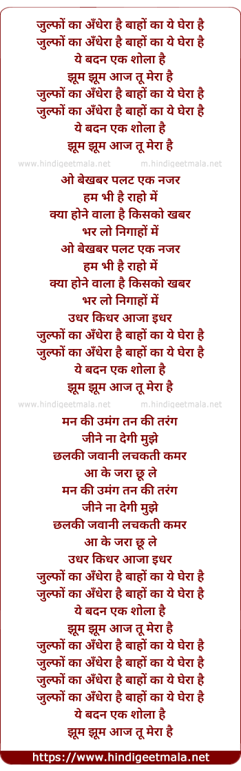 Lyrics of Zulfo Ka Andhera Hai, Baho Ka Ye Ghera Hai - जुल्फों का अँधेरा है, बाहों का ये घेरा है