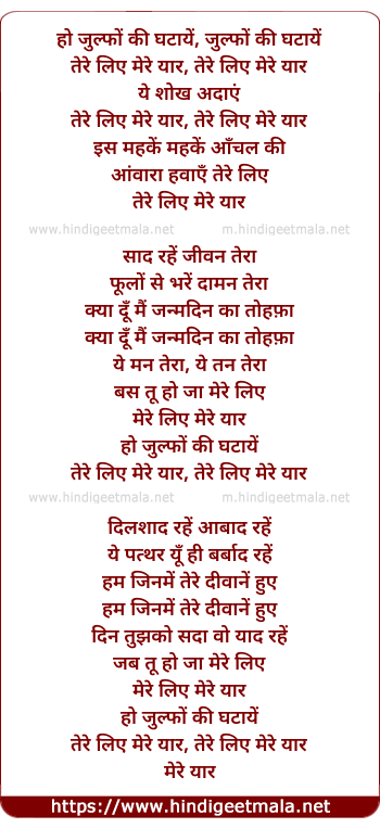 Lyrics of Zulfo Ki Ghataye Tere Liye - जुल्फों की घटायें तेरे लिए
