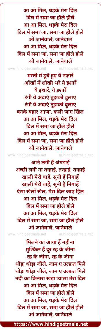 Lyrics of Aa Aa Mil, Dhadke Mera Dil - आ आ मिल, धड़के मेरा दिल