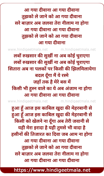 Lyrics of Aa Gaya Deewana - आ गया दीवाना