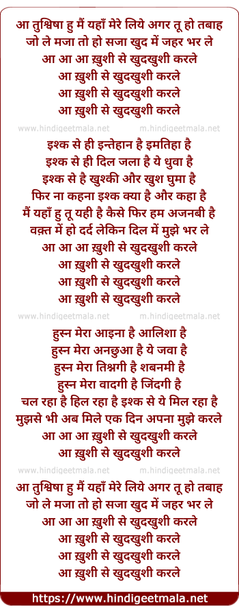 Lyrics of Aa Kushi Se Khud Kushi Karle - आ तुश्विषा हु मैं यहाँ मेरे लिये अगर तू हो तबाह