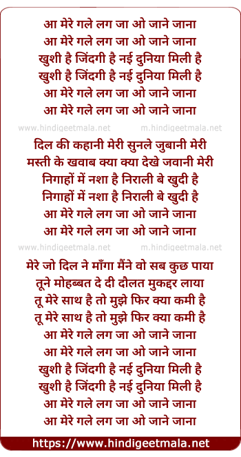 Lyrics of Aa Mere Gale Lag Ja O Jane Jana - आ मेरे गले लग जा ओ जाने जाना