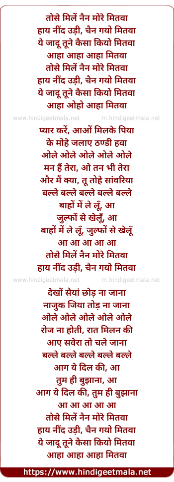 Lyrics of Aa Tose Miley Nain More Mitwa - आ तोसे मिलें नैन मोरे मितवा