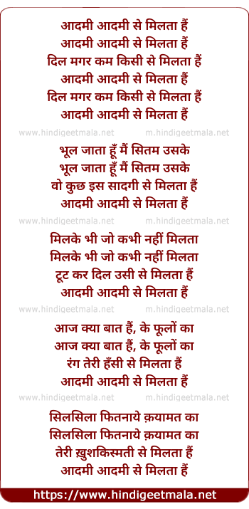 Lyrics of Aadamee Aadamee Se Milta Hai - आदमी आदमी से मिलता हैं