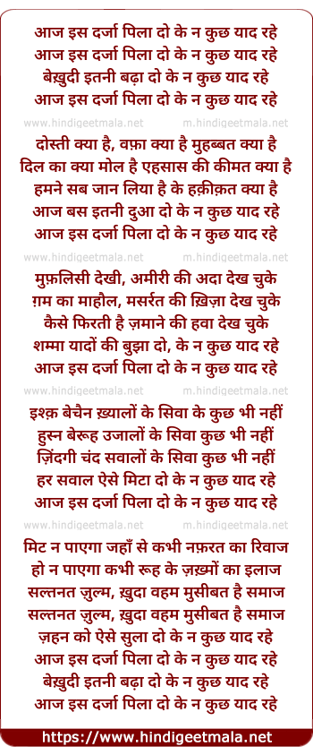 Lyrics of Aaj Is Darja Pila Do Ke - आज इस दर्जा पिला दो के न कुछ याद रहे