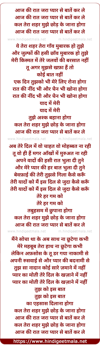 Lyrics of Aaj Ki Raat Jara Pyar Se Baate Karle - आज की रात जरा प्यार से बातें कर ले