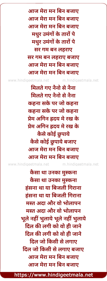Lyrics of Aaj Mera Man Been Bajaye - आज मेरा मन बिन बजाए