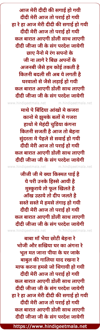 Lyrics of Aaj Meri Didi Ki Sagai Ho Gayi - आज मेरी दीदी की सगाई हो गयी